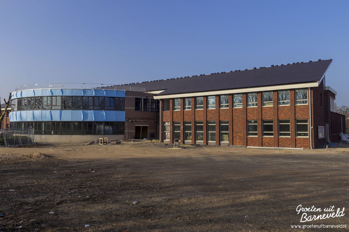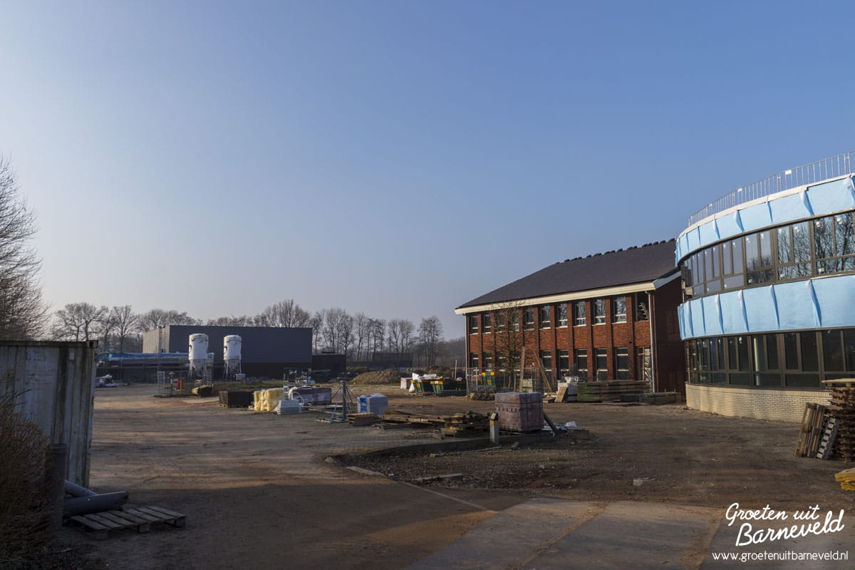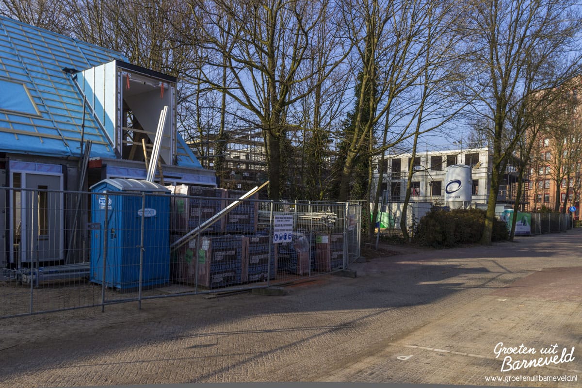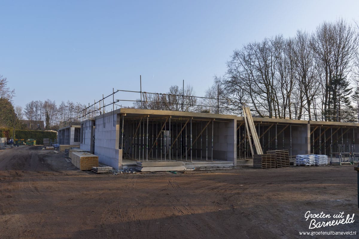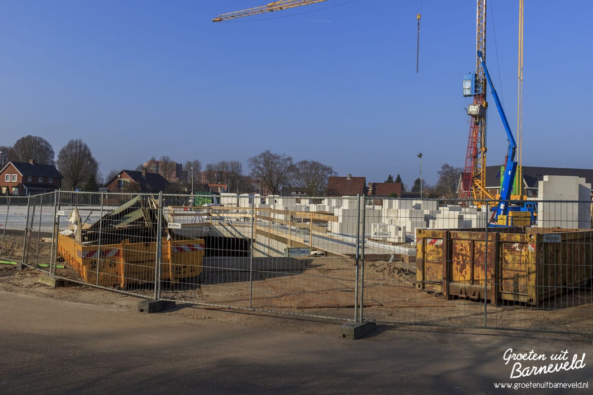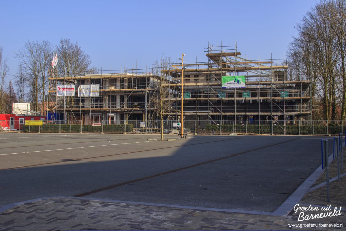 Overzicht van diverse bouwlocaties in de gemeente Barneveld. Foto’s van de Rabobank in Voorthuizen, nieuwbouw aan het Theaterplein, Eben-Haëzerschool en Verpleeghuis Norschoten. (9 foto’s)
